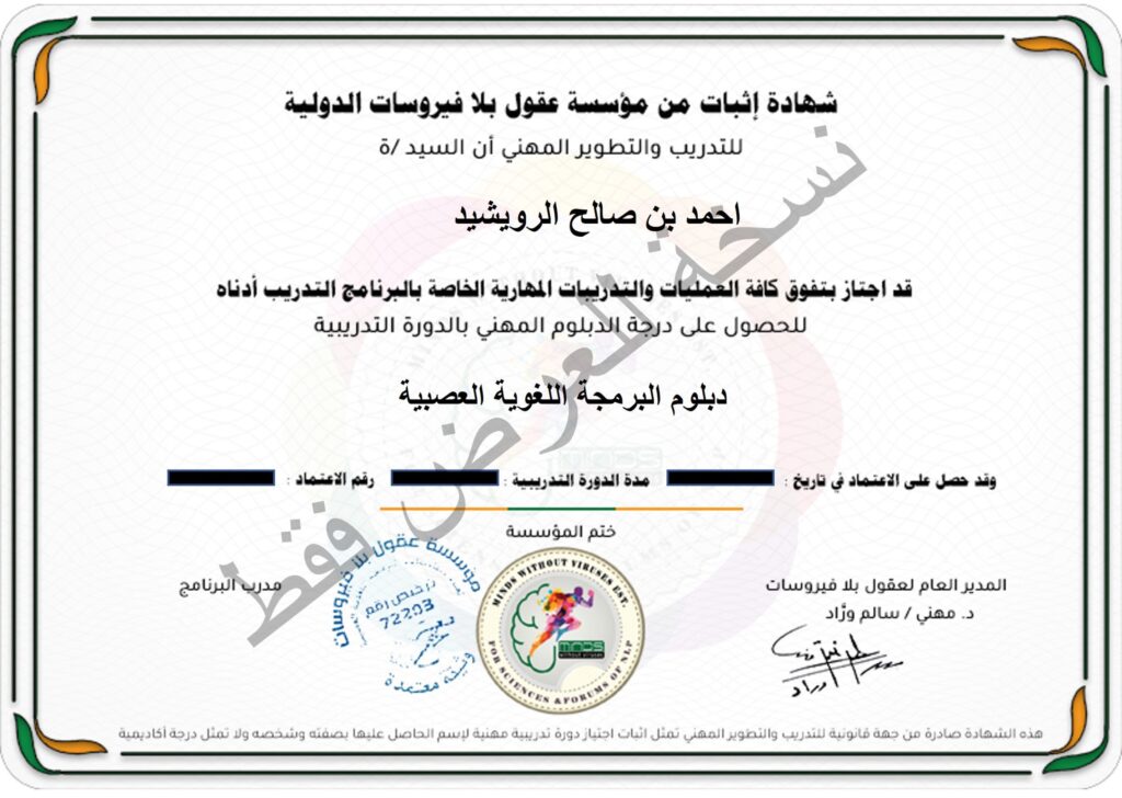 1- اعتماد مدرب دولي محترف من جهتين دوليتين وهما "مؤسسة عقول بلا فيروسات الدولية للتدريب والتطوير" ومؤسسة (الاتحاد العالمي للراسر الأمريكي للإحتراف المهني) وإصدار اعتمادك ألكترونيا وورقيا بإسمك.